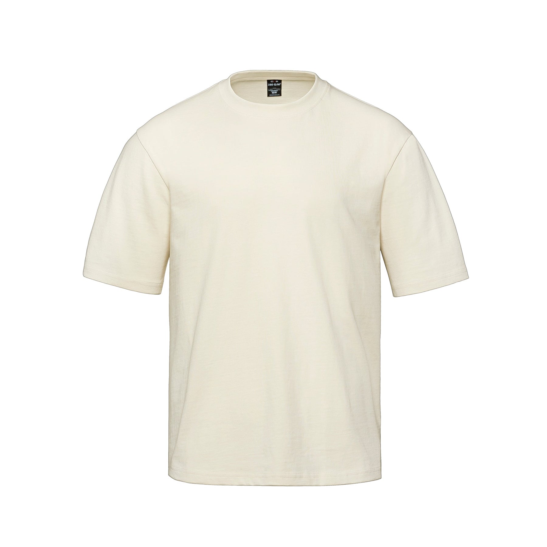 280 GSM - 8.3oz/yd2 - 13.7 oz/lin. yd. 100% cotton jersey. Rib knit neckline with spandex for shape retention. Jersey knit back neck tape. Tear-away label. Drop shoulder. Side Seamed.