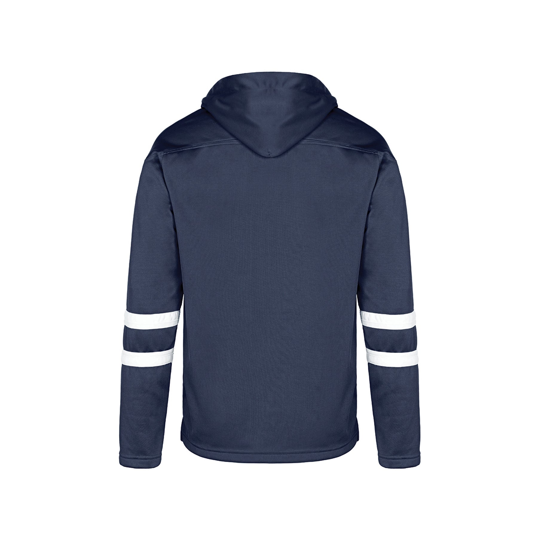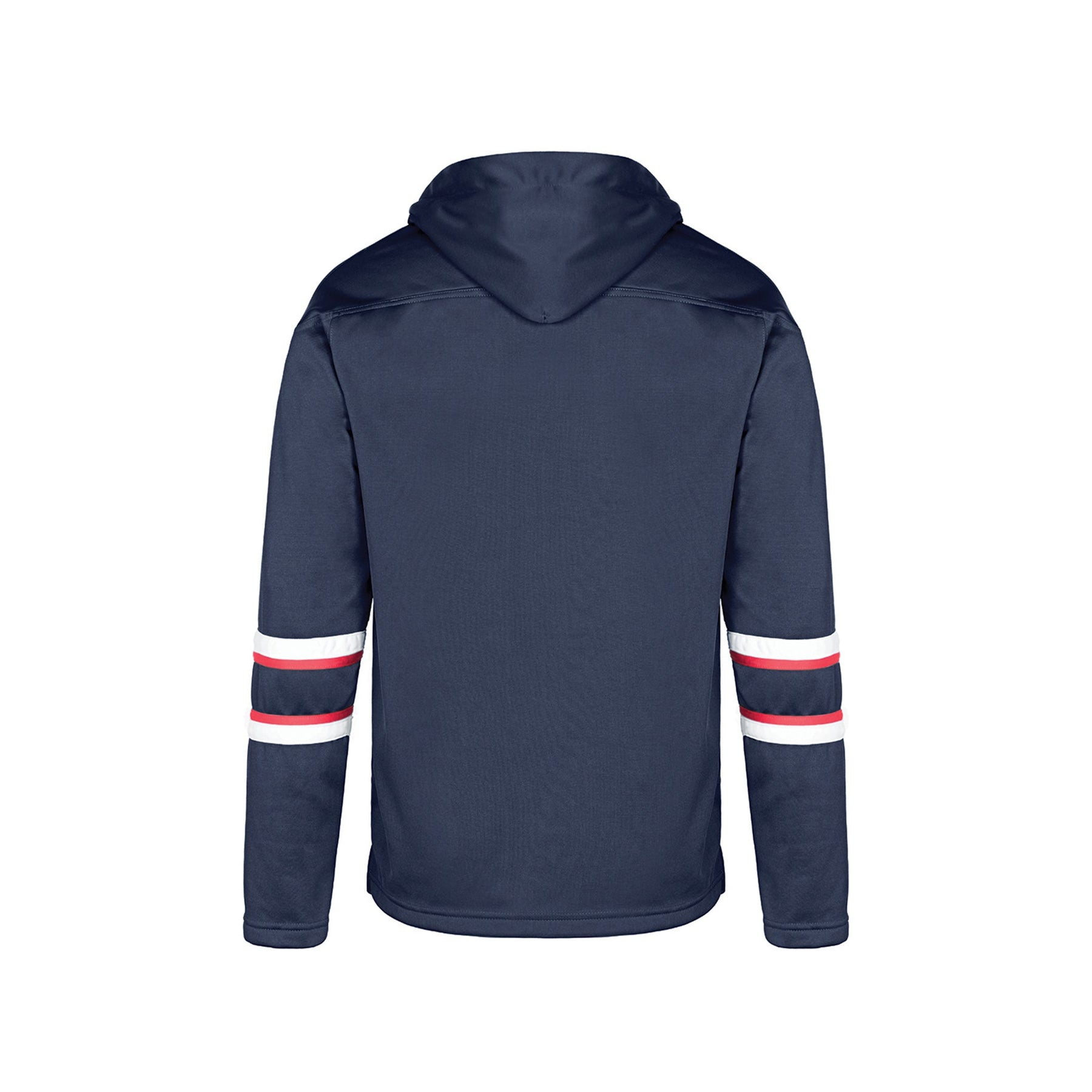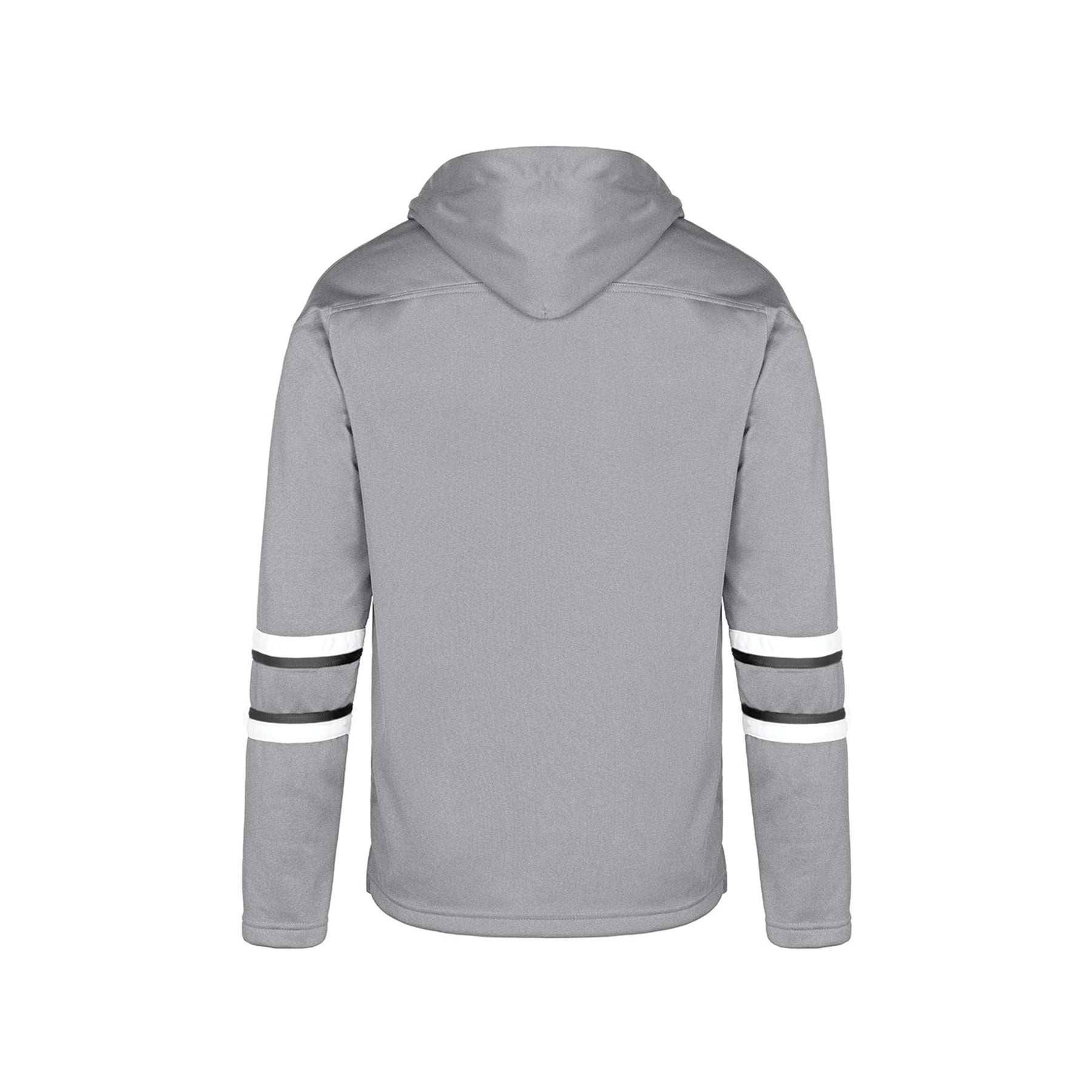 260 gsm – 7.7 oz./yd2 – 13 oz./lin. yd 100% polyester one side brushed fleece, anti-pill finish. Jersey lined hood. Kangaroo pocket. Contrast striping on sleeves and inside hood opening. Contrast taping at back neck and hem vents. Phone pocket hidden under kangaroo pocket. Adjustable hockey lace at neckline (not available on youth). Show your team spirit, additional hockey lace colours sold separately. V split hemmed body.